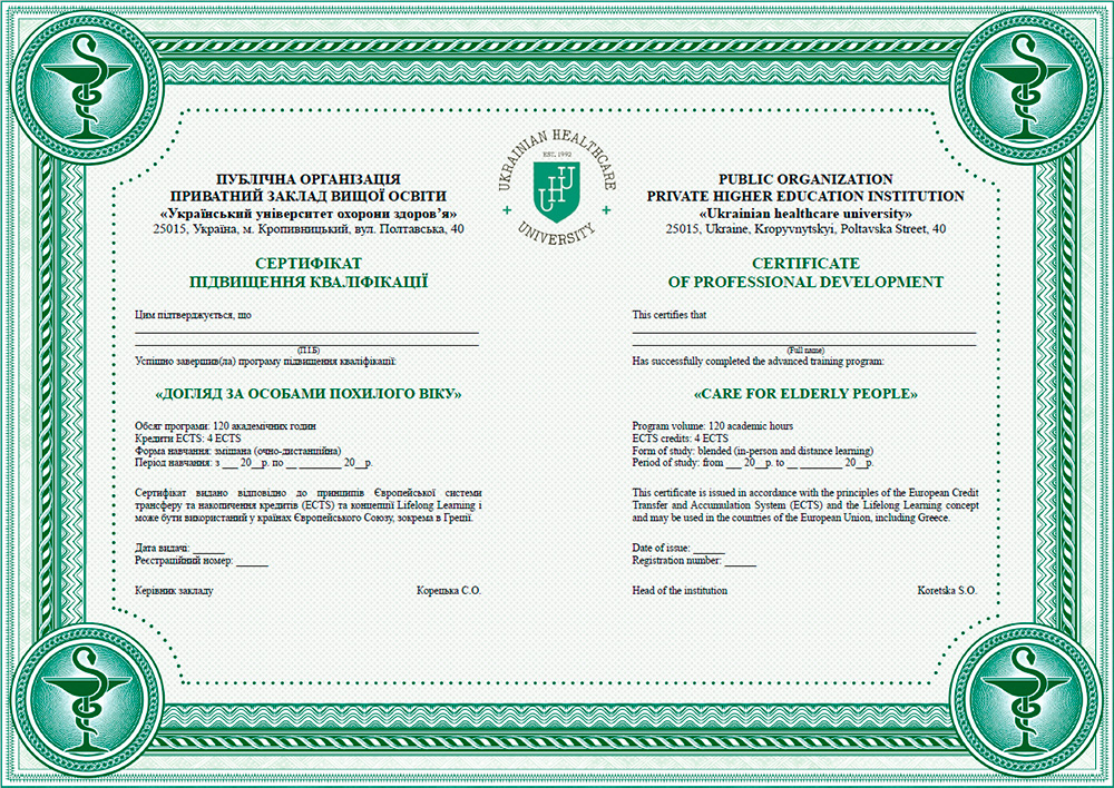 Програма обсягом 120 годин (4 кредити ЄКТС) розроблена для медичних та соціальних працівників, які працюють із особами похилого віку. Навчання проводиться у очній, дистанційній або змішаній формі через сучасну LMS.